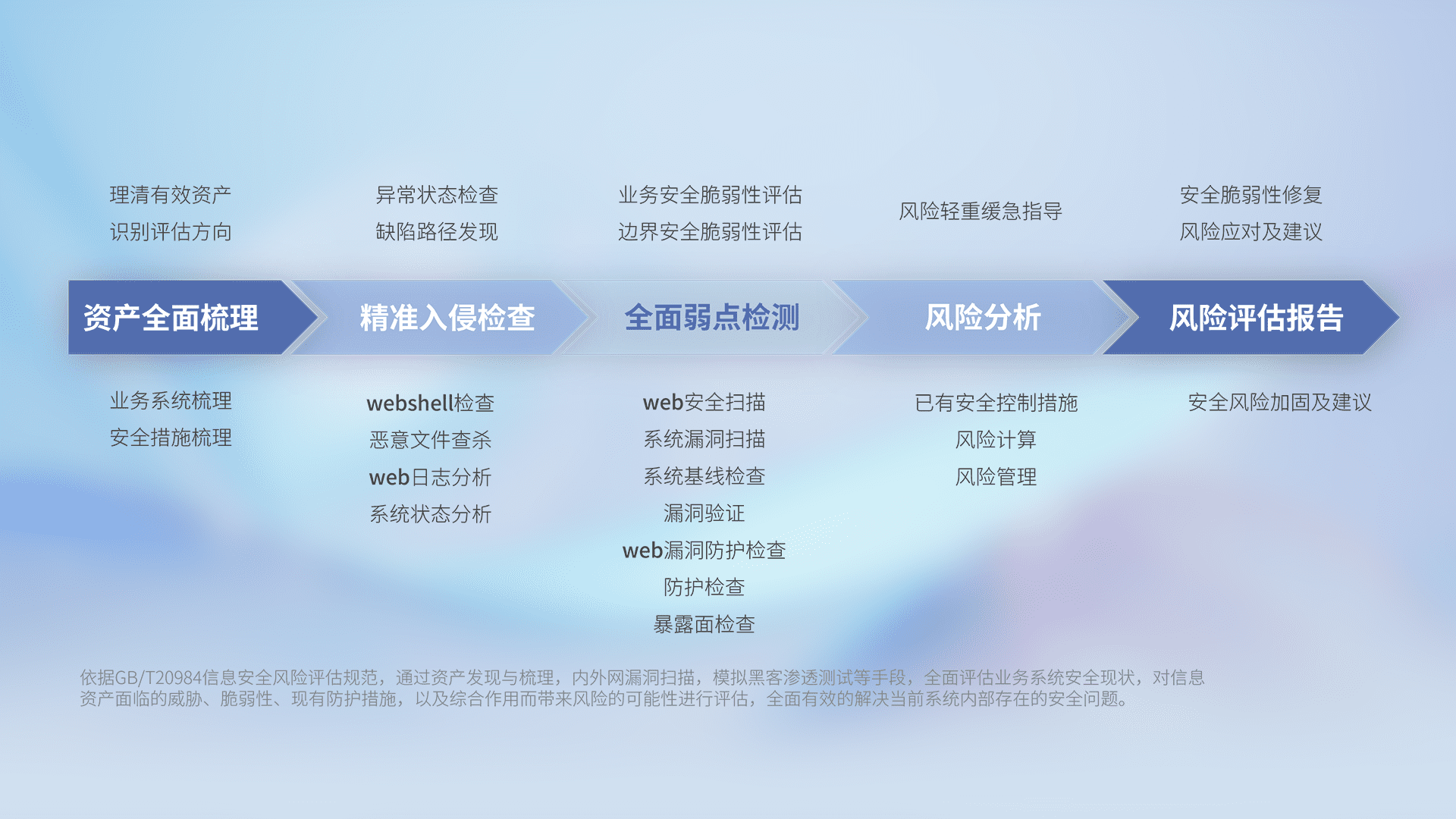 针对客户行业特性,,以专业的安全服务+多厂商联合解决方案提供专属的一站式安全管理服务,,,,帮助客户全面感知网络空间威胁,,,,基于识别、、检测、、分析、、、防护、、监测、、响应的服务理论模型,,,,从方案咨询、、、、集成交付、、、、评估验证、、优化加固、、、运维运营,,,,致力于为客户提供完整的闭环管理式安全服务。。以实战经验为客户打造高抵御风险的安全体系,,帮助客户发现威胁、、对抗威胁、、、、处置威胁,,不断积累安全对抗能力,,,,持续保障数字化安全。。。